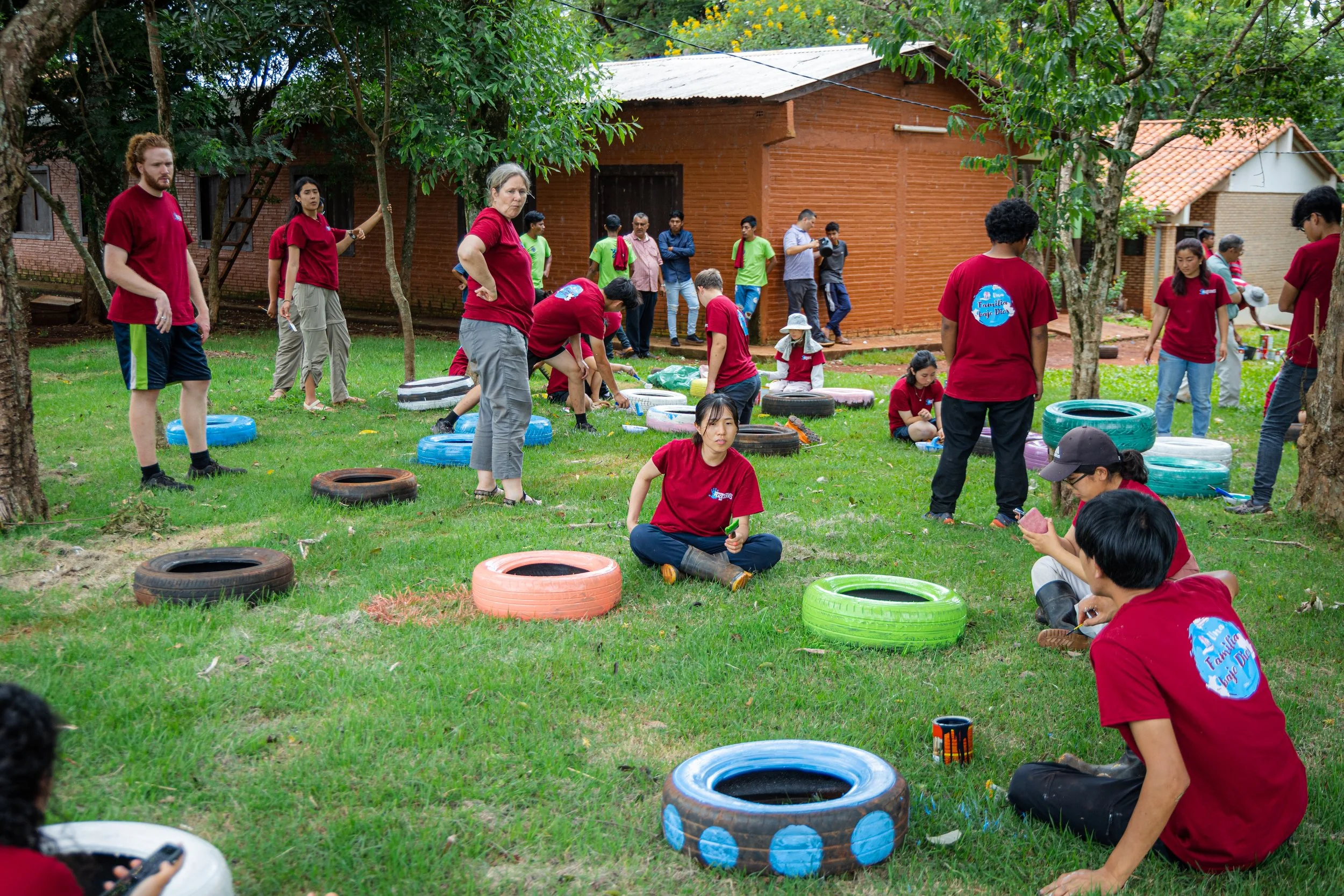 The spiritualist ended the ceremony wishing us great health, fortune, courage and energy. Even if his words had to go through 3 translators, from Guarani to Spanish, from Spanish to Japanese and from Japanese to English, we could not forget this kind man's most important guidance, to be confident in God. With these special words in our hearts we started working on our first project, decorating the school area with hand painted tire flower beds. We spent the rest of the time playing soccer with the locals.